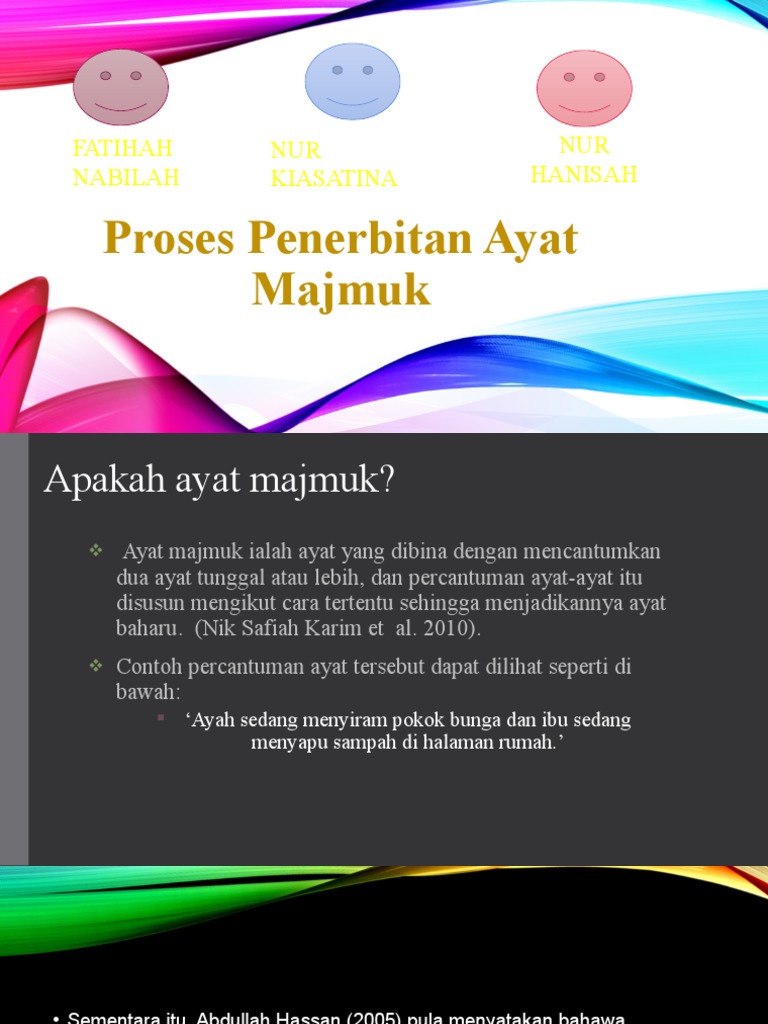 Ayat majmuk keterangan 9. 413 Menguasai Ayat Majmuk Campuran 46. Ayat majmuk pancangan Menurut Tatabahasa dewan 2010 terdapat tiga jenis ayat majmuk pancangan dalam bahasa Melayu yang ditentukan oleh cara pembentukan dan jenis ayat yang dipancangkan iaitu ayat relatif ayat komplemen dan ayat keteranganAyat komplemen Menurut Nik Safiah et al.